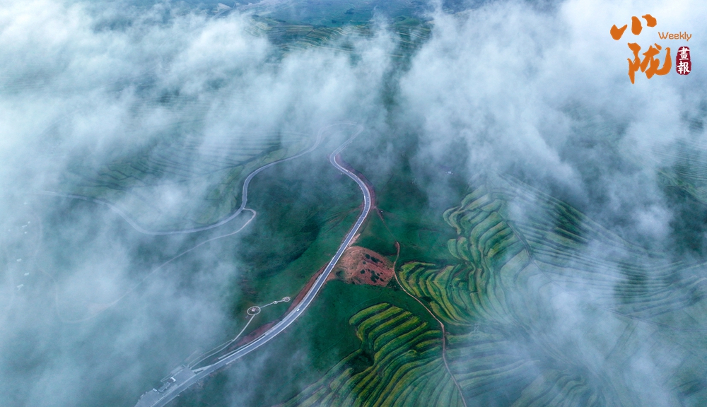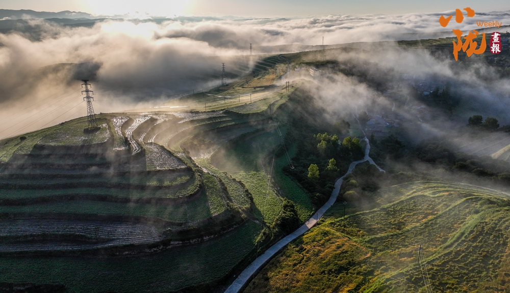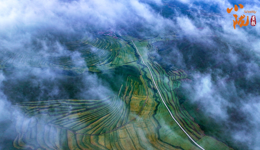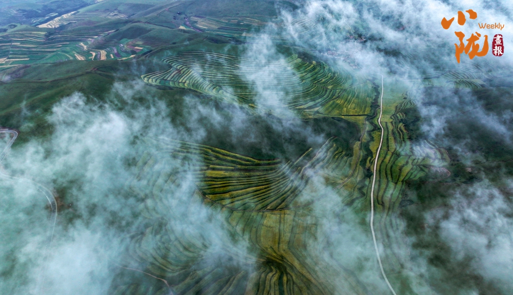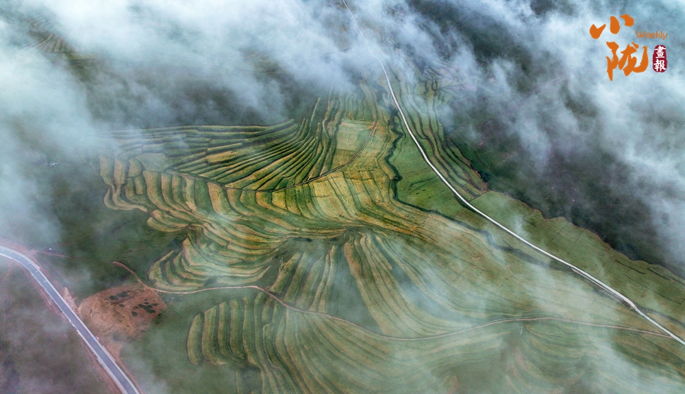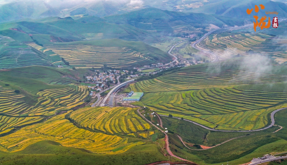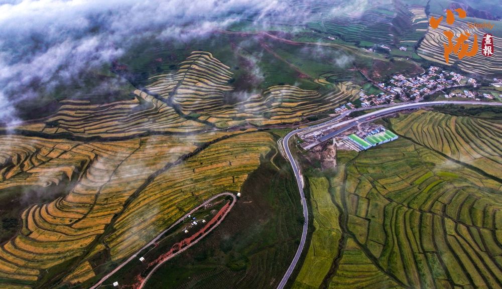 一場秋雨過(guo)后(hou),甘南(nan)臨潭連綿(mian)的(de)群山被云霧(wu)籠(long)罩,星羅棋布(bu)的(de)梯田上迎來收獲期(qi),稻浪滾滾,美(mei)不(bu)勝收。