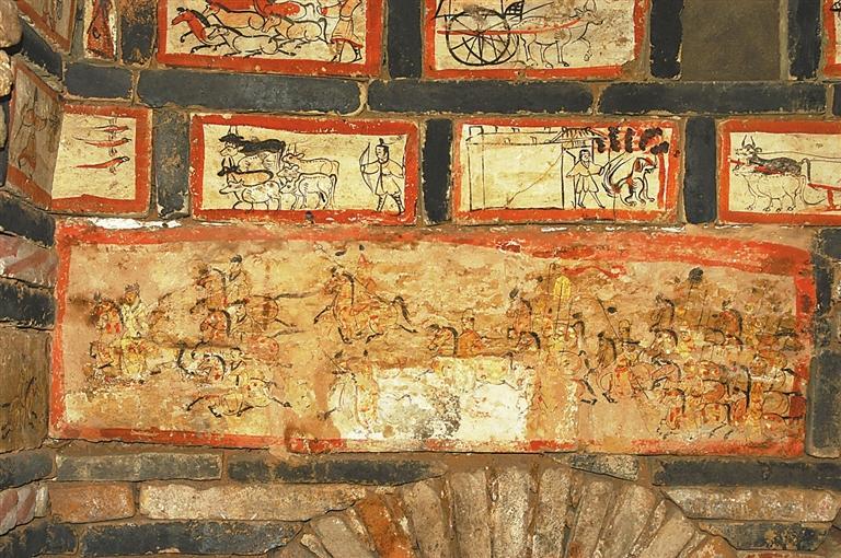 除以上(shang)幾個(ge)主要區域外,在(zai)武威、金昌(chang)、玉(yu)門(men)等地也(ye)零星發現有魏(wei)晉(jin)十(shi)六國(guo)時期(qi)的彩(cai)繪(hui)壁畫磚墓。如果(guo)將墓葬和彩(cai)色圖像相連接,這(zhe)就是一(yi)條(tiao)鋪設(she)在(zai)河(he)西大地上(shang)惹人注目、色彩(cai)斑斕、故事不斷(duan)的長卷連環畫。