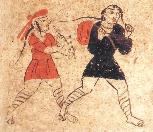 除此之外(wai),河西(xi)彩繪壁(bi)畫磚(zhuan)圖像(xiang)中,還有(you)(you)一(yi)些反(fan)映娛(yu)樂的(de)圖像(xiang),主要有(you)(you)樂舞圖和(he)(he)六(liu)(liu)博(bo)(bo)圖。高臺(tai)(tai)地埂(geng)坡壁(bi)畫中的(de)“角抵百戲(xi)”中,一(yi)著(zhu)(zhu)辮(bian)者在作(zuo)表演,他小腿部網狀綁(bang)腿,蹲踞,雙手攤(tan)開(kai),似乎是在表演魔術(shu),又似乎是在歡迎到場(chang)(chang)的(de)人們。“擊(ji)鼓(gu)(gu)”中,兩(liang)(liang)人網狀繃腿,髡(kun)發(fa)梳辮(bian),著(zhu)(zhu)黑裝(zhuang)者背鼓(gu)(gu),著(zhu)(zhu)紅裝(zhuang)者持雙鼓(gu)(gu)槌準備擊(ji)鼓(gu)(gu)。孫(sun)機先生謂(wei),戰國(guo)迄漢盛行六(liu)(liu)博(bo)(bo),博(bo)(bo)具(ju)和(he)(he)博(bo)(bo)戲(xi)的(de)圖像(xiang)在考古資料中不乏其例。甘肅(su)以武威磨嘴子漢墓出(chu)土木六(liu)(liu)博(bo)(bo)俑為例。六(liu)(liu)博(bo)(bo)俑以簡(jian)單明確的(de)藝術(shu)造型,刻畫了兩(liang)(liang)個老者全神貫(guan)注博(bo)(bo)弈(yi)的(de)場(chang)(chang)面(mian)(mian),惟(wei)妙惟(wei)肖地表現出(chu)對弈(yi)時蓄(xu)勢待(dai)發(fa)的(de)場(chang)(chang)面(mian)(mian)。在高臺(tai)(tai)壁(bi)畫墓中的(de)博(bo)(bo)戲(xi)場(chang)(chang)面(mian)(mian)略有(you)(you)不同,二博(bo)(bo)者戴(dai)船形帽,打手勢。從相(xiang)貌(mao)看,很可能是少數民族。高臺(tai)(tai)出(chu)土彩繪壁(bi)畫磚(zhuan)上,兩(liang)(liang)人動作(zuo)幅度更大,左邊一(yi)人的(de)黃紅色著(zhu)(zhu)裝(zhuang)和(he)(he)博(bo)(bo)具(ju)上的(de)零散(san)物(wu)品,顯得(de)場(chang)(chang)面(mian)(mian)更為熱烈激(ji)情。
