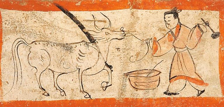 在(zai)(zai)彩(cai)繪畫像磚圖(tu)像中,反(fan)映(ying)家宴(yan)(yan)(yan)娛樂的占了(le)相當大的比例,這類題(ti)材(cai)的畫像磚在(zai)(zai)敦煌、嘉峪(yu)關、高臺(tai)(tai)等(deng)地(di)(di)都有出土。家宴(yan)(yan)(yan)的過程,通過屠宰(zai)—備宴(yan)(yan)(yan)—宴(yan)(yan)(yan)飲等(deng)環節完整地(di)(di)展(zhan)示(shi)出來(lai)(lai)。屠宰(zai)有椎牛(niu)、宰(zai)羊等(deng)場面(mian)。家宴(yan)(yan)(yan)時,主人席地(di)(di)而(er)坐(zuo),女仆搖扇(shan)伺候。嘉峪(yu)關果園(yuan)—新(xin)城墓中出土有椎牛(niu)的圖(tu)像,椎牛(niu)者(zhe)右(you)手牽韁(jiang),左手舉錘(chui),一(yi)器皿是(shi)用(yong)來(lai)(lai)盛放牛(niu)血的。在(zai)(zai)高臺(tai)(tai)地(di)(di)埂坡壁畫中的家宴(yan)(yan)(yan)“對(dui)酌圖(tu)”,則描(miao)繪的是(shi)二人戴帽著袍(pao),酒酣耳熱,左邊(bian)一(yi)人持耳背杯,做敬酒狀,右(you)邊(bian)一(yi)人作(zuo)揖謙讓的景象。