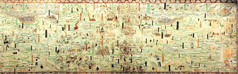 莫高(gao)(gao)窟61窟,建于五代(dai)(dai)晚期,是河西(xi)歸義軍節度使(shi)曹元忠及夫人(ren)開鑿的(de)(de)功德(de)窟,又稱“文殊(shu)堂”,主要為供奉文殊(shu)菩薩(sa)而修(xiu)。該窟的(de)(de)亮點是西(xi)壁的(de)(de)巨(ju)幅五臺山(shan)圖(tu)。這(zhe)是敦煌壁畫中規模(mo)最(zui)大(da)的(de)(de)山(shan)水人(ren)物圖(tu),也(ye)是全(quan)景式歷史地圖(tu)。五臺山(shan)圖(tu)長13.6米,高(gao)(gao)3.5米,畫中詳細描繪了東起(qi)河北正定,西(xi)至山(shan)西(xi)太原(yuan),方圓五百里(li)的(de)(de)山(shan)川地形(xing)及社會(hui)風情(qing),再現了五代(dai)(dai)時期五臺山(shan)佛(fo)國圣(sheng)境的(de)(de)氛圍(wei)。