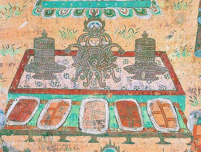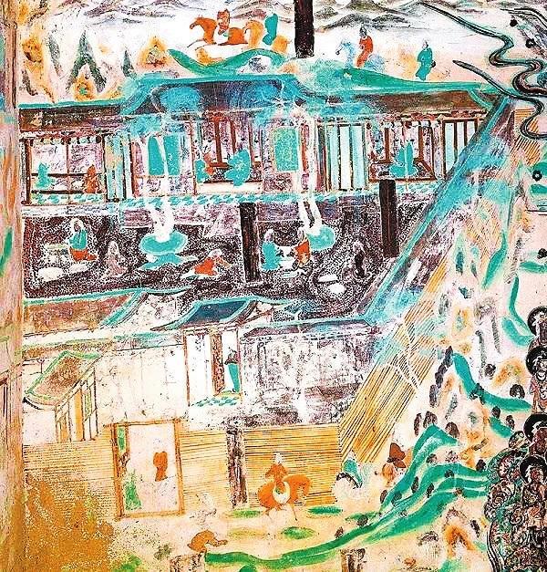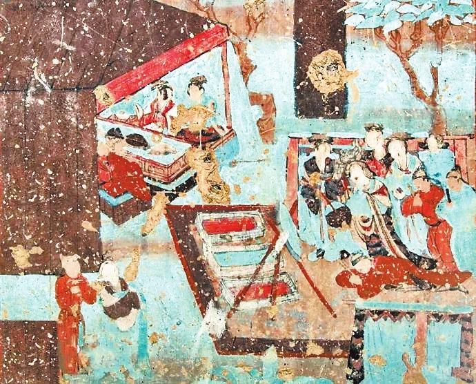 古人(ren)(ren)(ren)會在(zai)(zai)(zai)(zai)(zai)一(yi)(yi)年的(de)歲末舉(ju)行一(yi)(yi)次(ci)集體聚會,稱作“建(jian)福(fu)”。在(zai)(zai)(zai)(zai)(zai)敦煌文獻《社司轉帖》中(zhong)寫(xie)道:“右緣常年建(jian)福(fu)一(yi)(yi)日,人(ren)(ren)(ren)各(ge)爐(lu)餅壹(yi)雙,凈粟壹(yi)斗。幸(xing)請諸公等,帖至限今月廿二日卯時于安家(jia)酒(jiu)店(dian)取(qu)齊。”意思是(shi)(shi)說,只(zhi)要(yao)有(you)(you)(you)可能(neng),每(mei)(mei)年到了年末大(da)家(jia)都要(yao)選擇一(yi)(yi)日來(lai)(lai)進行建(jian)福(fu)。每(mei)(mei)家(jia)每(mei)(mei)戶(hu)需(xu)要(yao)按時把準備建(jian)福(fu)的(de)物資送過來(lai)(lai)。唐朝詩人(ren)(ren)(ren)李(li)白在(zai)(zai)(zai)(zai)(zai)《客中(zhong)行》一(yi)(yi)詩中(zhong)寫(xie)道:“蘭(lan)(lan)陵(ling)美酒(jiu)郁(yu)金香,玉碗盛(sheng)來(lai)(lai)琥珀光(guang)。但(dan)使主人(ren)(ren)(ren)能(neng)醉客,不(bu)知(zhi)何處是(shi)(shi)他鄉(xiang)。”意思是(shi)(shi)說蘭(lan)(lan)陵(ling)美酒(jiu)甘醇甜(tian)美,就(jiu)像郁(yu)金香一(yi)(yi)樣芬芳(fang)四溢(yi)。興來(lai)(lai)盛(sheng)滿玉碗,泛(fan)出琥珀光(guang)晶瑩迷人(ren)(ren)(ren)。主人(ren)(ren)(ren)端出如此好酒(jiu),定能(neng)醉倒他鄉(xiang)之(zhi)(zhi)(zhi)客。飲(yin)酒(jiu)之(zhi)(zhi)(zhi)后哪(na)能(neng)分清故鄉(xiang)與(yu)他鄉(xiang)呢?歲暮聚飲(yin)蘊(yun)含(han)有(you)(you)(you)辭舊迎新、攘兇(xiong)納吉(ji)的(de)美好愿望(wang)。在(zai)(zai)(zai)(zai)(zai)莫高窟(ku)(ku)第12窟(ku)(ku)壁畫(hua)(hua)中(zhong)有(you)(you)(you)一(yi)(yi)幅(fu)“帳篷酒(jiu)肆圖(tu)”:畫(hua)(hua)面中(zhong)圍坐在(zai)(zai)(zai)(zai)(zai)條形長桌兩邊(bian)正(zheng)盡興暢飲(yin)的(de)客人(ren)(ren)(ren)為七人(ren)(ren)(ren),還有(you)(you)(you)兩個(ge)熱(re)情忙碌的(de)服務人(ren)(ren)(ren)員。整個(ge)畫(hua)(hua)面是(shi)(shi)一(yi)(yi)幅(fu)酒(jiu)酣(han)耳熱(re)、興致高昂的(de)歡飲(yin)圖(tu)。更為氣勢恢宏、熱(re)鬧非凡的(de)是(shi)(shi)莫高窟(ku)(ku)第23窟(ku)(ku)壁畫(hua)(hua)中(zhong)一(yi)(yi)幅(fu)“院(yuan)落(luo)圖(tu)”:畫(hua)(hua)面中(zhong)分院(yuan)落(luo)之(zhi)(zhi)(zhi)內(nei)與(yu)院(yuan)落(luo)之(zhi)(zhi)(zhi)外兩個(ge)部(bu)分,院(yuan)落(luo)之(zhi)(zhi)(zhi)內(nei)是(shi)(shi)世俗的(de)世界(jie),畫(hua)(hua)面上布(bu)局著鱗次(ci)櫛比的(de)廳堂(tang)房屋,有(you)(you)(you)人(ren)(ren)(ren)正(zheng)在(zai)(zai)(zai)(zai)(zai)庖廚、有(you)(you)(you)人(ren)(ren)(ren)正(zheng)在(zai)(zai)(zai)(zai)(zai)對弈、有(you)(you)(you)人(ren)(ren)(ren)正(zheng)在(zai)(zai)(zai)(zai)(zai)暢聊、有(you)(you)(you)人(ren)(ren)(ren)正(zheng)在(zai)(zai)(zai)(zai)(zai)團聚,也有(you)(you)(you)人(ren)(ren)(ren)正(zheng)在(zai)(zai)(zai)(zai)(zai)說教(jiao),總之(zhi)(zhi)(zhi)表現的(de)是(shi)(shi)我們日常生活的(de)百態(tai)。院(yuan)落(luo)之(zhi)(zhi)(zhi)外是(shi)(shi)佛國(guo)世界(jie),整體呈現出肅(su)穆莊(zhuang)嚴之(zhi)(zhi)(zhi)感。有(you)(you)(you)趣的(de)是(shi)(shi)在(zai)(zai)(zai)(zai)(zai)佛國(guo)與(yu)世俗世界(jie)中(zhong)間,畫(hua)(hua)的(de)是(shi)(shi)服飾艷麗,騎馬(ma)遠行的(de)人(ren)(ren)(ren)們。