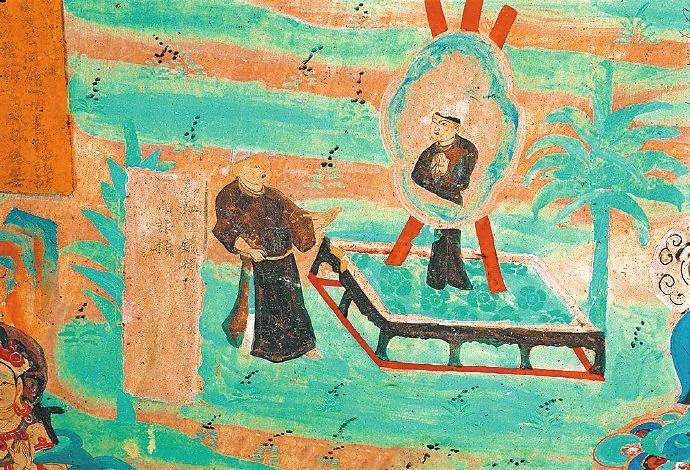 戰國(guo)(guo)時(shi)期(qi)楚國(guo)(guo)詩人屈原在《漁父(fu)》一(yi)文(wen)中(zhong)寫(xie)道:“吾聞之,新沐者(zhe)(zhe)必彈(dan)(dan)冠,新浴者(zhe)(zhe)必振衣。安能以(yi)身之察察,受(shou)物之汶汶者(zhe)(zhe)乎(hu)?”意思(si)是說我聽說剛洗過頭的(de)(de)(de)人一(yi)定(ding)會去彈(dan)(dan)彈(dan)(dan)帽(mao)子上的(de)(de)(de)灰塵;剛洗過澡的(de)(de)(de)人一(yi)定(ding)要抖抖衣服的(de)(de)(de)灰塵。怎(zen)能讓清白的(de)(de)(de)身體去接觸世俗塵埃的(de)(de)(de)污染呢?當年的(de)(de)(de)敦煌人走出溫泉,在身心放松之后,就該靜觀(guan)返照自(zi)(zi)(zi)己了(le)。在莫高窟(ku)第85窟(ku)中(zhong)有一(yi)幅(fu)“曲(qu)花(hua)式鏡(jing)(jing)圖”:畫面上在一(yi)個(ge)正方(fang)形鏤空的(de)(de)(de)底座上擺放著一(yi)個(ge)巨大的(de)(de)(de)曲(qu)花(hua)式鏡(jing)(jing),鏡(jing)(jing)子式樣別致,明亮(liang)澄(cheng)澈。藍色的(de)(de)(de)曲(qu)花(hua)式樣引人矚目。但畫面上最吸睛的(de)(de)(de)是一(yi)位(wei)魁梧俊(jun)朗身著一(yi)襲赭色長袍的(de)(de)(de)男(nan)子,他(ta)正在鏡(jing)(jing)子前(qian)仔細地(di)打量自(zi)(zi)(zi)己,而(er)鏡(jing)(jing)中(zhong)映(ying)射(she)出他(ta)神情凝重的(de)(de)(de)情態來(lai)。原來(lai),古人照鏡(jing)(jing)除了(le)正衣冠之外(wai),還(huan)有反觀(guan)自(zi)(zi)(zi)照的(de)(de)(de)含義,在鏡(jing)(jing)子前(qian)良久(jiu)地(di)注視自(zi)(zi)(zi)己,就是對自(zi)(zi)(zi)己反省、頓(dun)悟的(de)(de)(de)過程。“一(yi)年好景(jing)君須記”,走過四季,到了(le)歲末,該是每個(ge)人回(hui)望來(lai)時(shi)路,展望前(qian)方(fang)的(de)(de)(de)時(shi)候了(le)。