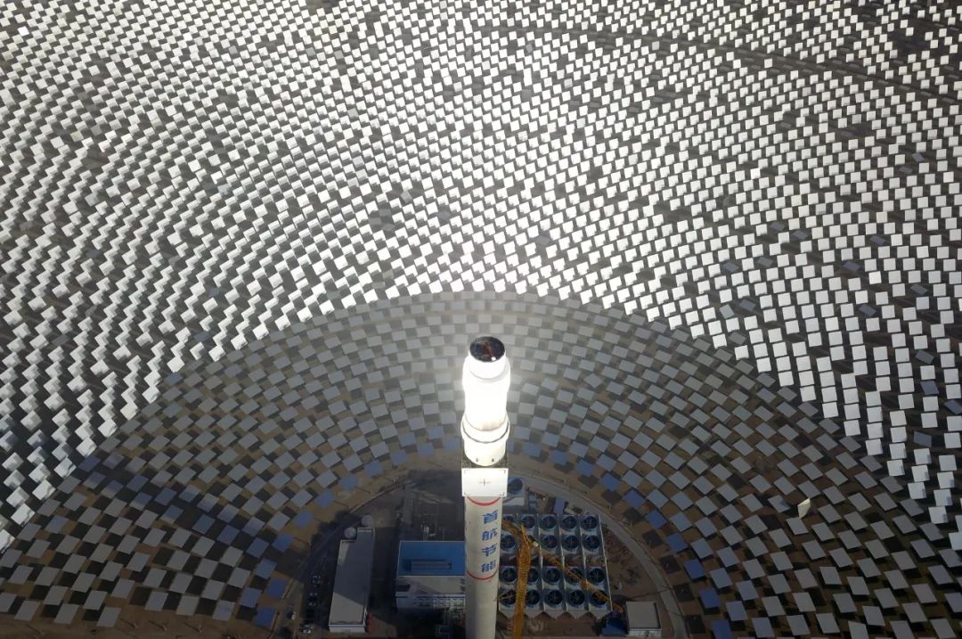 在敦煌(huang),茫茫戈壁(bi)灘(tan)上一(yi)望無際,此時(shi)一(yi)顆耀眼(yan)光(guang)(guang)(guang)點(dian)絢麗奪目。循光(guang)(guang)(guang)而至,這萬(wan)丈光(guang)(guang)(guang)芒來(lai)自1.2萬(wan)面(mian)“超級鏡子(zi)(zi)”的反射。每面(mian)鏡子(zi)(zi)采(cai)光(guang)(guang)(guang)面(mian)積為115平方米(mi),呈同心(xin)圓(yuan)狀(zhuang)在地面(mian)排(pai)列,如同向日葵般追逐太陽,將(jiang)陽光(guang)(guang)(guang)反射匯聚(ju)到圓(yuan)心(xin)一(yi)座260米(mi)高的吸(xi)熱(re)塔頂端。在那里,熔(rong)鹽(yan)被加熱(re)到500攝氏度以上,之后通過(guo)高溫熔(rong)鹽(yan)發電。
