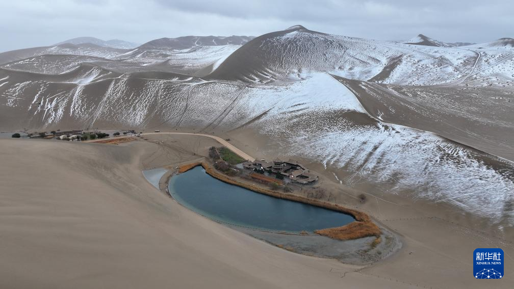 這是(shi)11月23日(ri)拍攝的敦煌市鳴沙(sha)山月牙泉景區雪(xue)景(無人機照(zhao)片(pian))。新華社發(張曉亮 攝)