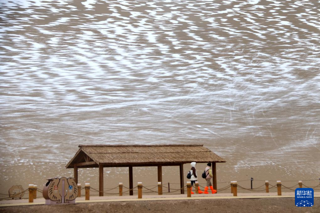 11月(yue)23日,游客在敦(dun)煌(huang)市鳴沙山月(yue)牙(ya)泉景區(qu)欣賞雪景。新華社發(張曉亮(liang) 攝)