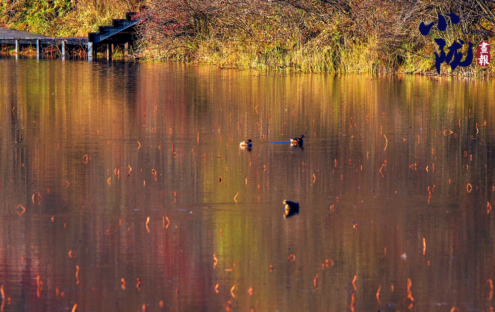 湫水深不可測(ce),湫池依偎在(zai)(zai)深林密(mi)樹旁(pang)邊,湫面(mian)蕩起縷(lv)縷(lv)波紋,浮光(guang)泛金,一群(qun)悠閑的野(ye)鴨在(zai)(zai)水面(mian)上游(you)來游(you)去。