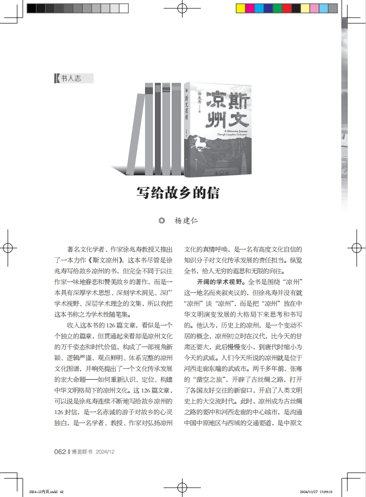 著(zhu)名文(wen)化(hua)學者(zhe)、作(zuo)家徐兆壽教授(shou)又推出了一本力作(zuo)《斯文(wen)涼(liang)州(zhou)》,這本書(shu)盡管是徐兆壽寫給故鄉涼(liang)州(zhou)的(de)書(shu),但完全不(bu)同于以往作(zuo)家一味(wei)地眷(juan)戀和贊美故鄉的(de)著(zhu)作(zuo),而是一本具有深(shen)厚(hou)學術(shu)(shu)思(si)想、深(shen)刻學術(shu)(shu)洞見(jian)、深(shen)廣學術(shu)(shu)視(shi)野、深(shen)層學術(shu)(shu)理念的(de)文(wen)集,所以我把這本書(shu)稱之為(wei)學術(shu)(shu)性隨筆(bi)集。