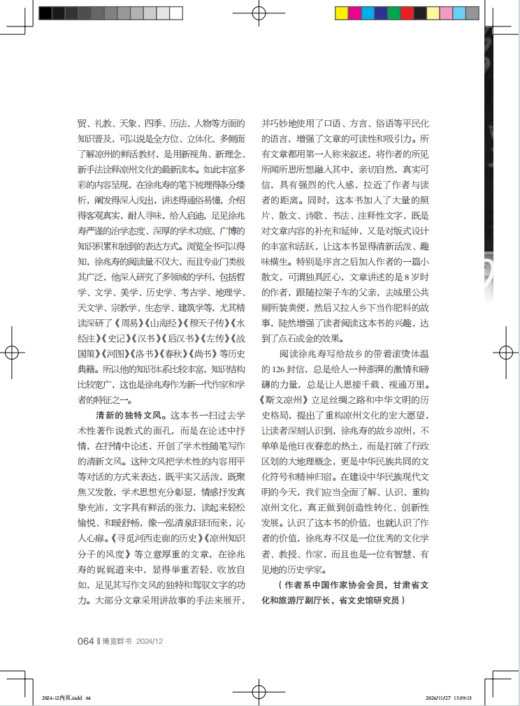 收入這本書的(de)(de)(de)(de)126篇(pian)文(wen)(wen)章,看似是(shi)一(yi)個個獨立的(de)(de)(de)(de)篇(pian)章,但貫通起來(lai)看卻(que)是(shi)涼(liang)(liang)(liang)州(zhou)文(wen)(wen)化的(de)(de)(de)(de)萬千姿態和時代價值,構(gou)成了一(yi)部視(shi)角新穎、邏輯嚴謹、觀(guan)點鮮明、體系完(wan)整(zheng)的(de)(de)(de)(de)涼(liang)(liang)(liang)州(zhou)文(wen)(wen)化圖譜,并響亮提出了一(yi)個文(wen)(wen)化傳承發(fa)展的(de)(de)(de)(de)宏(hong)大(da)命題——如何重新認識(shi)、定位、構(gou)建中(zhong)華文(wen)(wen)明格局下的(de)(de)(de)(de)涼(liang)(liang)(liang)州(zhou)文(wen)(wen)化。這 126 篇(pian)文(wen)(wen)章,可(ke)以說是(shi)徐兆壽連續不(bu)斷地寫給(gei)故(gu)鄉涼(liang)(liang)(liang)州(zhou)的(de)(de)(de)(de)126封(feng)信,是(shi)一(yi)名赤誠的(de)(de)(de)(de)游子(zi)對故(gu)鄉的(de)(de)(de)(de)心靈獨白,是(shi)一(yi)名學者、教授、作家(jia)對弘揚涼(liang)(liang)(liang)州(zhou)文(wen)(wen)化的(de)(de)(de)(de)真情(qing)呼(hu)喚,是(shi)一(yi)名有高(gao)度文(wen)(wen)化自信的(de)(de)(de)(de)知(zhi)識(shi)分(fen)子(zi)對文(wen)(wen)化傳承發(fa)展的(de)(de)(de)(de)責任擔當。縱覽全(quan)書,給(gei)人無窮的(de)(de)(de)(de)遐思(si)和無限的(de)(de)(de)(de)向往。