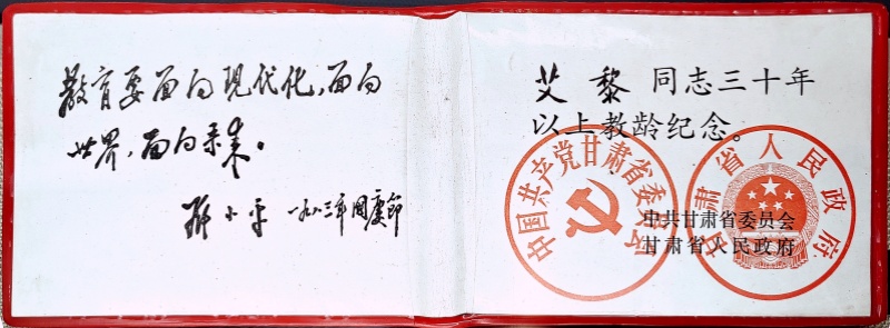 這是(shi)(shi)一本從教(jiao)(jiao)(jiao)滿三十(shi)(shi)年(nian)的(de)榮(rong)譽(yu)證書(shu)。由(you)中共甘肅省委、甘肅省人(ren)民政府(fu)頒發。證書(shu)內頁的(de)左側是(shi)(shi)鄧(deng)小平1983年(nian)國(guo)慶節題寫的(de)“教(jiao)(jiao)(jiao)育(yu)要面向(xiang)現代(dai)化,面向(xiang)世界(jie),面向(xiang)未來(lai)”。右側是(shi)(shi)“艾(ai)黎(li)同(tong)志三十(shi)(shi)年(nian)以上教(jiao)(jiao)(jiao)齡紀(ji)念”。“三個(ge)面向(xiang)”是(shi)(shi)為北京(jing)景山學校(xiao)的(de)題詞,是(shi)(shi)鄧(deng)小平提出(chu)的(de)教(jiao)(jiao)(jiao)育(yu)發展(zhan)改(gai)革(ge)方針,旨在推動中國(guo)的(de)教(jiao)(jiao)(jiao)育(yu)現代(dai)化進程(cheng),使其更加開放和(he)(he)適應未來(lai)發展(zhan)的(de)需要,面向(xiang)世界(jie),吸收(shou)國(guo)際先進的(de)教(jiao)(jiao)(jiao)育(yu)理念和(he)(he)經驗;同(tong)時展(zhan)望未來(lai),培(pei)養適應未來(lai)社會需要的(de)人(ren)才。