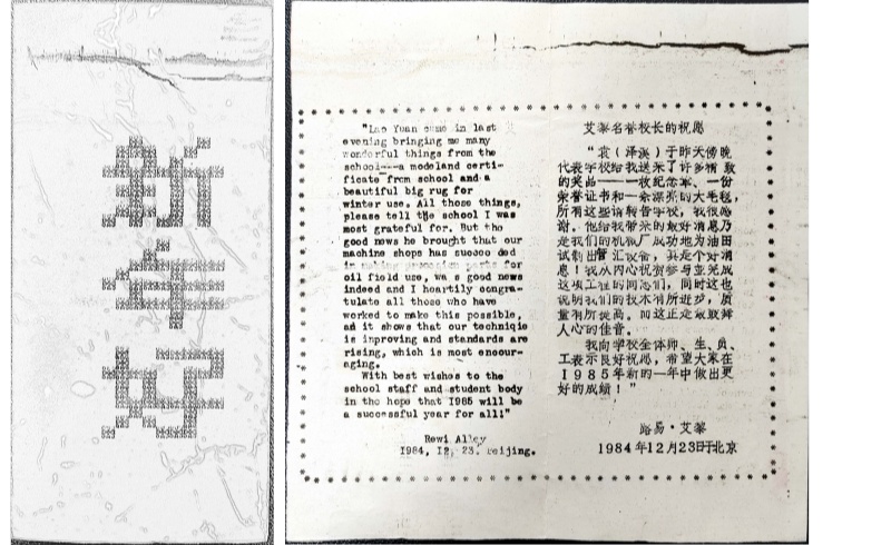 證(zheng)書是由石油(you)(you)工業部培黎石油(you)(you)技校(xiao)申報的。1984年(nian)12月30日(ri),培黎石油(you)(you)技校(xiao)自制的新年(nian)賀卡(ka)內頁用中(zhong)英文印上了名(ming)譽校(xiao)長(chang)艾黎的祝(zhu)愿: