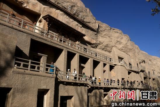 初冬時(shi)節,游客(ke)走進世界文化遺(yi)產甘肅敦煌莫高(gao)窟(ku)欣(xin)賞燦爛(lan)的石(shi)窟(ku)藝術,品味悠久(jiu)的敦煌歷史(shi)文化。