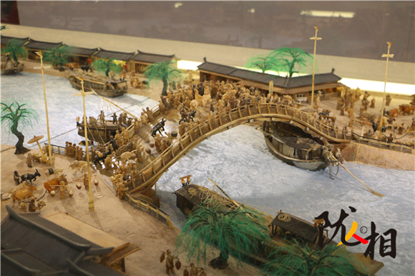 劉金祿歷時25年創作的白牦牛(niu)角微(wei)雕(diao)版(ban)《清(qing)明上河圖》,長16米(mi),寬(kuan)1.6米(mi),共微(wei)雕(diao)人物1460名,動(dong)(dong)物300余頭、房(fang)間400余間、大小船只30余艘、牛(niu)馬車輛(liang)50余輛(liang)。小到(dao)杯盞酒(jiu)蝶,大到(dao)雕(diao)梁畫(hua)棟,都有(you)生動(dong)(dong)刻畫(hua),徹底將《清(qing)明上河圖》由平(ping)面畫(hua)作搬上了立體(ti)展臺。