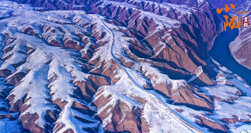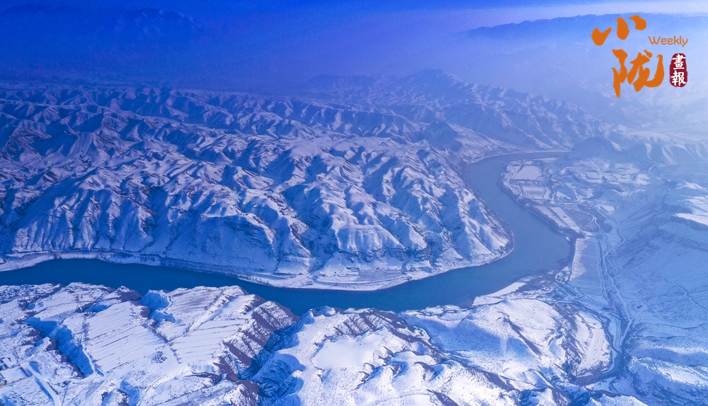 蜿蜒的黃河猶(you)如一條藍絲帶飄舞在白雪覆蓋的山間、田野,兩岸被雪裝扮得格(ge)外壯麗,從空(kong)中(zhong)俯瞰,宛若一幅水墨丹青畫。