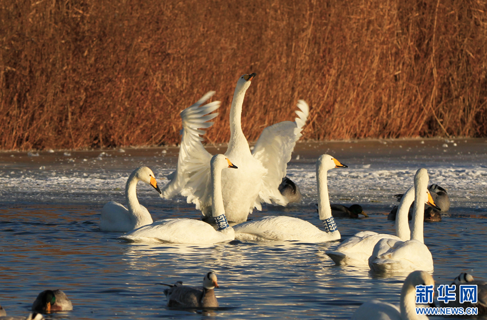 冬日(ri)里(li),在(zai)甘肅省張掖(ye)國家(jia)濕地公(gong)園,數只(zhi)白(bai)天鵝沐浴著陽光(guang)悠閑地嬉(xi)戲、覓食(shi),呈現(xian)出一(yi)幅(fu)自然和諧的生(sheng)態畫(hua)卷。新華網發(陳禮(li) 攝)