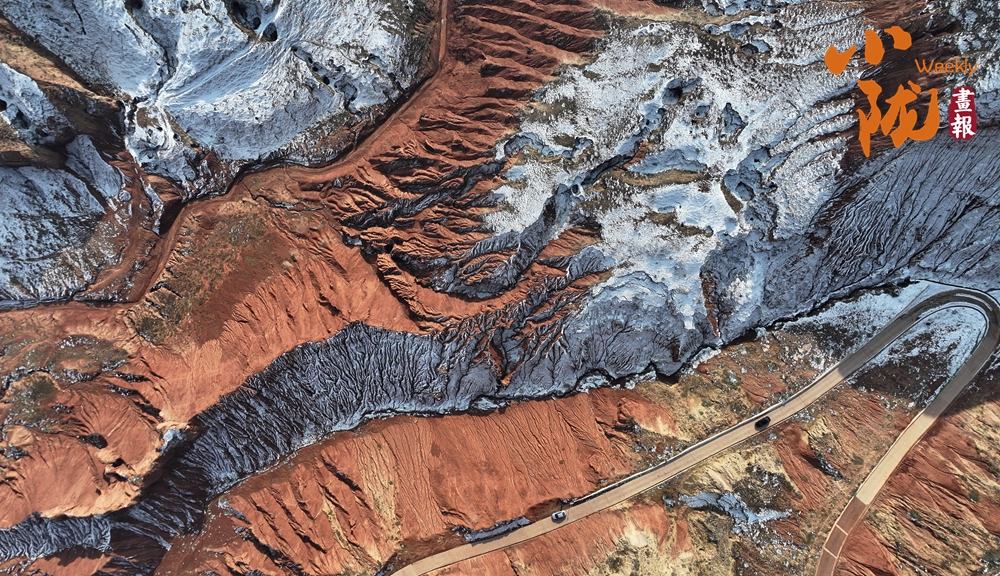 冬雪覆蓋在色彩斑斕的丹霞地貌之上,從高(gao)空俯視,層理交錯,色彩鮮(xian)艷,似(si)一幅油(you)畫(hua)。