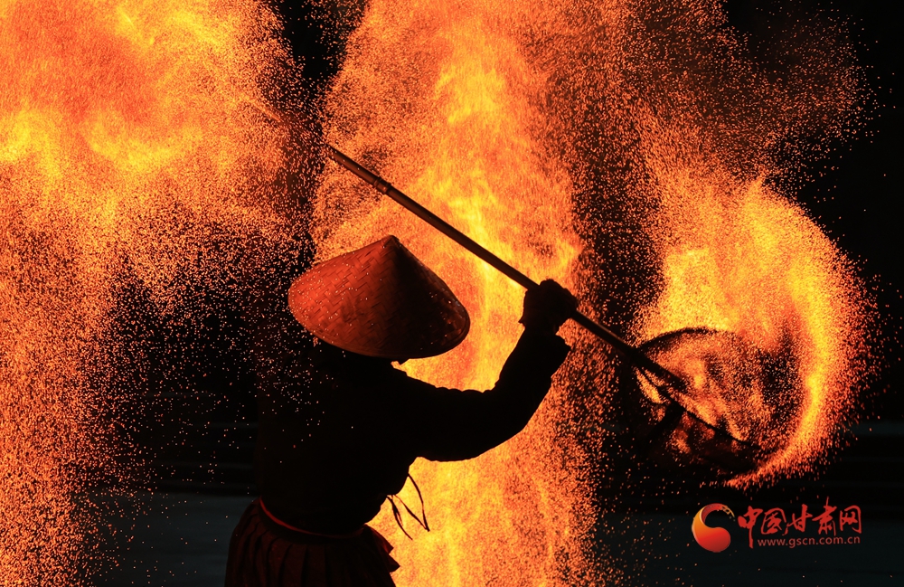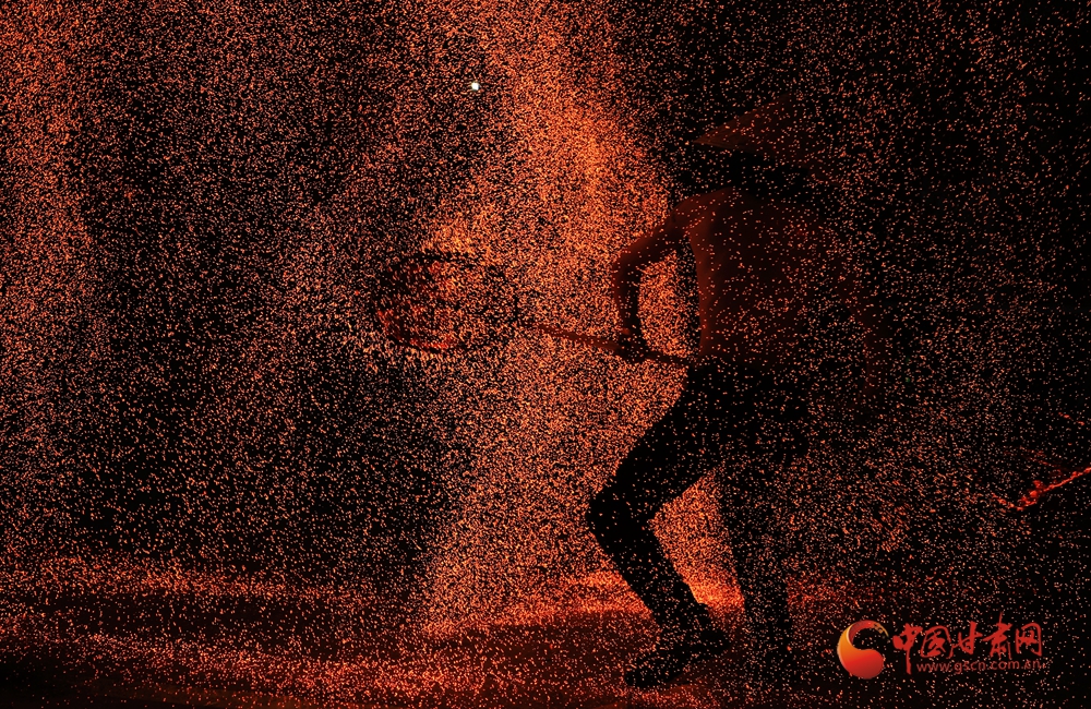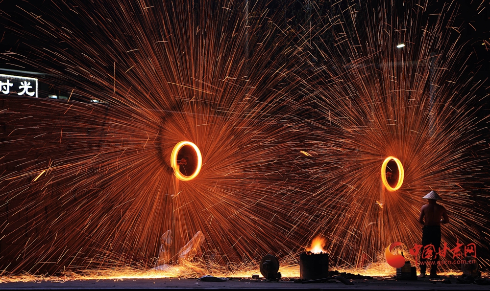 打鐵(tie)花表演(yan)時,傳承人將(jiang)生(sheng)鐵(tie)熔到1600℃高溫(wen)后,把鐵(tie)汁注入“花棒”,用撬棍(gun)或木鍬(qiao)猛(meng)擊,使鐵(tie)水打上天(tian)空四散,形成璀(cui)璨(can)絢麗的(de)火樹銀花景觀。