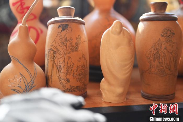 2月8日,甘肅省(sheng)蘭州(zhou)市(shi)城關區“非遺(yi)年貨購(gou)物月”活動現場(chang)展出的刻葫蘆文創產品。 中新(xin)社記(ji)者 李亞龍(long) 攝