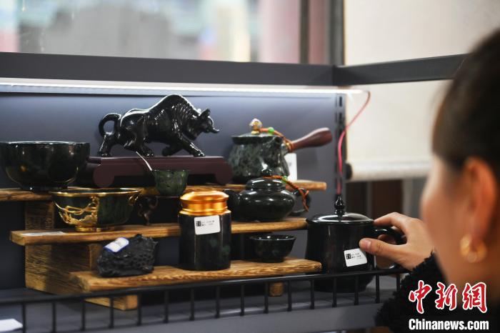 2月8日(ri),甘肅(su)省蘭州(zhou)市城關區“非遺年貨(huo)購物月”活動(dong)現場,游人挑選(xuan)武(wu)山(shan)鴛鴦玉(yu)夜光杯(bei)茶(cha)具。中新社記者 李(li)亞(ya)龍(long) 攝