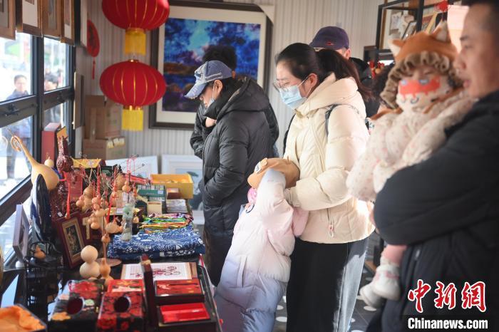 2月(yue)8日,甘(gan)肅(su)省蘭(lan)州市城關區(qu)“非(fei)遺(yi)年貨購物月(yue)”活動現場,游人選購非(fei)遺(yi)文(wen)創產品。 中(zhong)新社記者 李亞龍 攝(she)