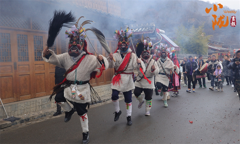 在白馬(ma)語言中,“池(chi)哥(ge)”意為(wei)山(shan)神(shen),“晝”即舞(wu)。每(mei)年春節(jie)期間,文縣(xian)白馬(ma)山(shan)寨都會表演(yan)(yan)池(chi)哥(ge)晝,舞(wu)隊一般由9人組成,其中4人扮成山(shan)神(shen)(池(chi)哥(ge)),2人扮成菩(pu)薩(池(chi)姆),2人扮成夫妻(池(chi)瑪),還有1個兒童扮成猴娃子。他們(men)從早到晚挨家逐戶地表演(yan)(yan),意在為(wei)村(cun)民除惡祛邪,祈求吉祥。表演(yan)(yan)時,舞(wu)者頭戴青面獠牙的木雕彩繪面具,身著特色服飾(shi),舞(wu)步遒勁粗獷,舞(wu)姿(zi)有殺(sha)野豬(zhu)、打(da)老虎(hu)等動作,既帶有神(shen)秘的氣息,又(you)顯示出濃(nong)厚的娛樂色彩。