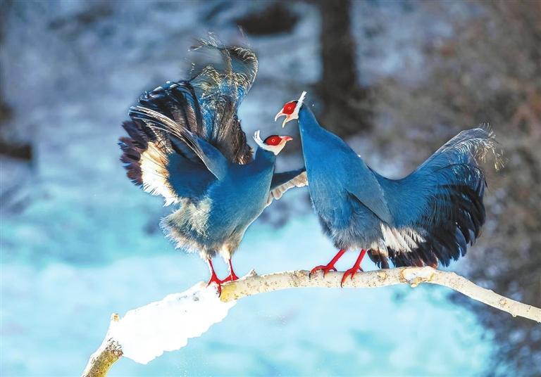 藍(lan)馬(ma)(ma)(ma)雞(ji)(ji)是(shi)珍稀名貴的禽類(lei),頭側緋紅(hong),耳羽簇白色、突出于(yu)(yu)頸部頂上(shang),通體(ti)藍(lan)灰(hui)色,中央(yang)尾(wei)羽特長而翹(qiao)起,尾(wei)羽披(pi)散下垂如馬(ma)(ma)(ma)尾(wei),故名藍(lan)馬(ma)(ma)(ma)雞(ji)(ji)。冬日里(li),藍(lan)馬(ma)(ma)(ma)雞(ji)(ji)成(cheng)群飛落山腳覓(mi)食(shi),藍(lan)羽丹頂行走(zou)在雪地(di)上(shang)格外搶眼。數量繁多(duo)的藍(lan)馬(ma)(ma)(ma)雞(ji)(ji)是(shi)祁連山野生山地(di)雞(ji)(ji)的“顏(yan)值(zhi)擔當”。覓(mi)食(shi)時,藍(lan)馬(ma)(ma)(ma)雞(ji)(ji)常(chang)用爪刨挖(wa)林中空(kong)地(di)苔蘚和林緣草地(di),尋找掉(diao)落的云杉種子。刨食(shi)的過程會讓土壤松動,便于(yu)(yu)種子生根發芽,促(cu)進(jin)林區(qu)植物天(tian)然更(geng)新。