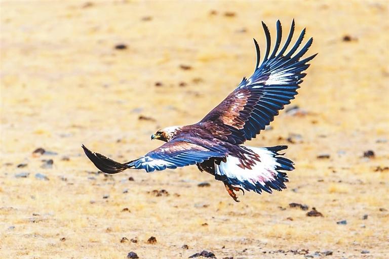 金雕以(yi)其卓越(yue)的(de)(de)捕(bu)獵技巧和優雅的(de)(de)飛行(xing)姿(zi)態而聞名,主要棲(qi)息于(yu)高山(shan)草(cao)原、森林及(ji)河谷地(di)帶(dai)。在(zai)祁連山(shan)遼闊的(de)(de)草(cao)原之(zhi)(zhi)上(shang),金雕展開它那(nei)寬闊且有力的(de)(de)雙(shuang)翅,在(zai)藍天之(zhi)(zhi)中肆意(yi)翱翔。陽光傾灑(sa)下(xia)來(lai),深(shen)褐色的(de)(de)羽(yu)毛閃爍著(zhu)如(ru)同(tong)金屬般耀眼(yan)的(de)(de)光澤,猶(you)如(ru)披上(shang)了一(yi)(yi)件(jian)堅不可摧(cui)的(de)(de)鎧(kai)甲(jia),威風(feng)凜凜。它那(nei)犀利的(de)(de)眼(yan)神,仿佛能夠穿透重重迷霧,洞察(cha)這片廣袤(mao)土地(di)上(shang)的(de)(de)每一(yi)(yi)個細微變(bian)化,盡顯王者風(feng)范。它身姿(zi)雄偉而威嚴,宛如(ru)一(yi)(yi)位至(zhi)高無上(shang)的(de)(de)王者,向(xiang)整(zheng)個世界展示著(zhu)它那(nei)不容小覷的(de)(de)力量(liang)與威嚴,默(mo)默(mo)地(di)守護著(zhu)這片廣袤(mao)無垠的(de)(de)草(cao)原天地(di)。
