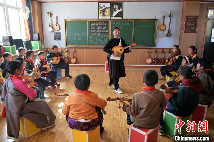 2月(yue)26日,甘肅省甘南藏族自治(zhi)州瑪曲縣寄宿制(zhi)藏族小學龍頭(tou)琴彈唱社團活動,加措正在教孩子們彈唱。九美旦(dan)增 攝