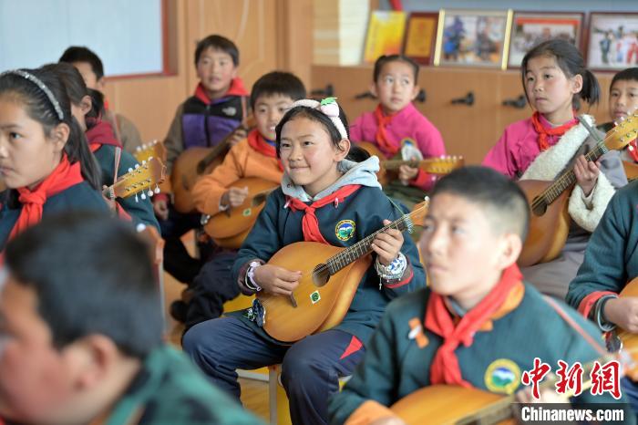 中新社記者近日探訪瑪曲縣寄宿制藏族小學彈(dan)唱社團活動,未進(jin)教室,已(yi)聽到室內傳(chuan)出的歡(huan)快琴聲(sheng)和笑聲(sheng)。
