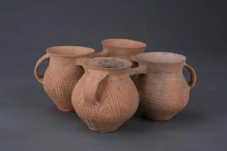 出土刻劃紋單耳四(si)聯(lian)罐(鎮(zhen)原縣博物館藏)