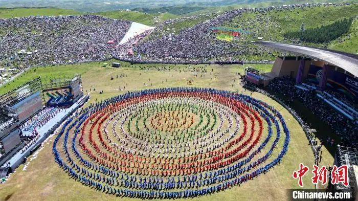 2024年(nian)8月4日,第22屆九色甘南香巴拉(la)旅游藝術節在甘肅省甘南藏族自治州當周草原(yuan)開(kai)幕。圖(tu)為開(kai)幕式現場(chang)鍋(guo)莊舞表演。(資(zi)料(liao)圖(tu))九美旦增 攝