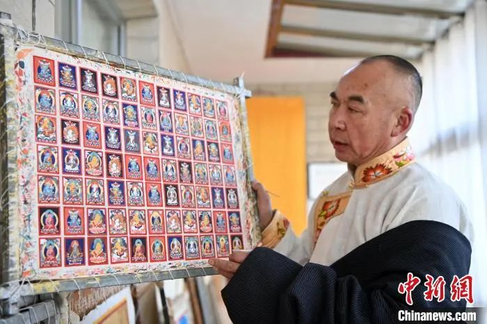 2024年(nian)2月2日,甘肅夏河,甘南(nan)藏族唐卡國家(jia)級代表(biao)性傳承人交巴加布在家(jia)中展(zhan)示其繪制的唐卡。(資(zi)料圖)九美旦增 攝
