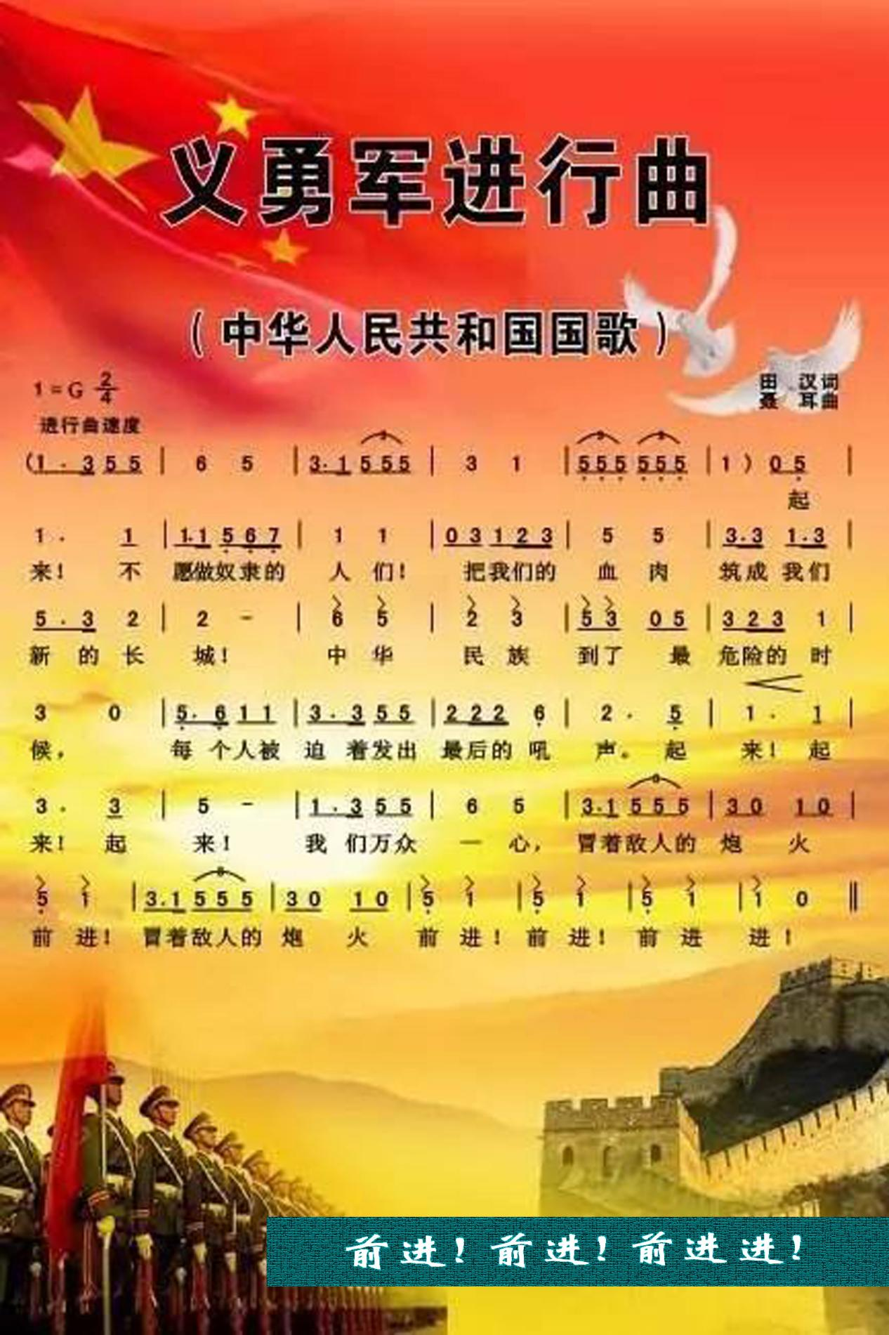 ⑧前(qian)(qian)進(jin)(jin)!前(qian)(qian)進(jin)(jin)!前(qian)(qian)進(jin)(jin)進(jin)(jin)!:《義勇軍進(jin)(jin)行曲(qu)(qu)》這一段歌(ge)詞是作曲(qu)(qu)家聶耳改定的。為(wei)了使歌(ge)曲(qu)(qu)曲(qu)(qu)調和節(jie)奏(zou)更加(jia)有力,聶耳把田漢原來的“我(wo)們(men)萬眾(zhong)一心,冒著(zhu)(zhu)敵人的飛機(ji)大炮(pao)前(qian)(qian)進(jin)(jin)。前(qian)(qian)進(jin)(jin)!前(qian)(qian)進(jin)(jin)!前(qian)(qian)進(jin)(jin)!”改為(wei)“我(wo)們(men)萬眾(zhong)一心,冒著(zhu)(zhu)敵人的炮(pao)火(huo),前(qian)(qian)進(jin)(jin)!冒著(zhu)(zhu)敵人的炮(pao)火(huo),前(qian)(qian)進(jin)(jin)!前(qian)(qian)進(jin)(jin)!前(qian)(qian)進(jin)(jin)進(jin)(jin)!”全(quan)國政協委員、國家一級指揮、解放軍軍樂團前(qian)(qian)團長于海曾談到:“前(qian)(qian)進(jin)(jin),前(qian)(qian)進(jin)(jin),前(qian)(qian)進(jin)(jin)進(jin)(jin)!”這七個字堪稱國歌(ge)的點睛之(zhi)筆。“前(qian)(qian)進(jin)(jin)進(jin)(jin)”的節(jie)奏(zou)感,凸顯了國歌(ge)精神(shen)的進(jin)(jin)行時態。正是這種(zhong)精神(shen)一直在指引我(wo)們(men),激勵著(zhu)(zhu)我(wo)們(men)。