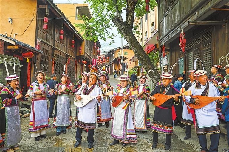 在文縣鐵樓藏族鄉草河壩(ba)村白馬山寨,土(tu)琵琶彈(dan)唱表演吸引游(you)客駐足觀賞。新甘肅·甘肅日(ri)報記者 馮(feng)樂凱