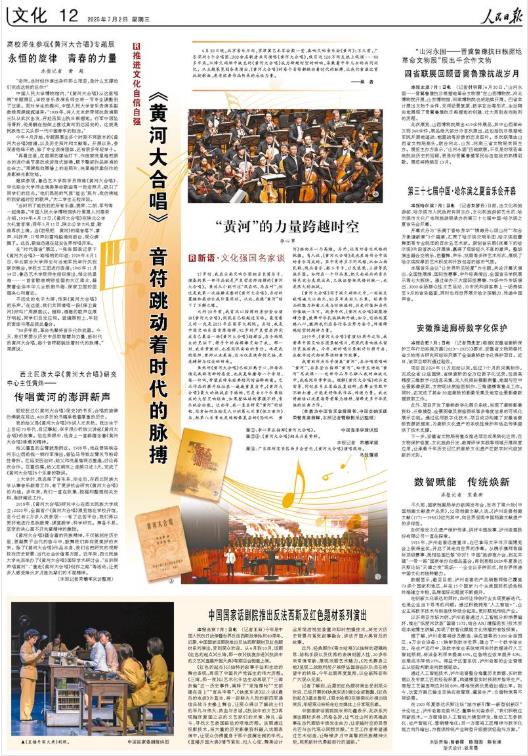 6月30日晚,北京音(yin)樂(le)廳內,京津冀藝術家會聚一(yi)堂,奏響交響音(yin)樂(le)會《黃河》;不久(jiu)前(qian),廣東深(shen)圳8個合唱團、300余名歌者(zhe)共(gong)同演(yan)(yan)唱《黃河大(da)合唱》,吸(xi)引近120萬網(wang)友(you)線上(shang)觀演(yan)(yan)……80多年來,從烽火硝煙中誕生的《黃河大(da)合唱》成(cheng)為跨越時(shi)空(kong)的回響,承載著中華兒女的共(gong)同記憶。從主(zhu)題展覽到(dao)各類(lei)演(yan)(yan)出,《黃河大(da)合唱》的每個音(yin)符(fu)都跳(tiao)動著時(shi)代的脈搏(bo),讓(rang)我(wo)們重溫這首抗戰歌曲,感受(shou)經典作品傳承的永恒力量。