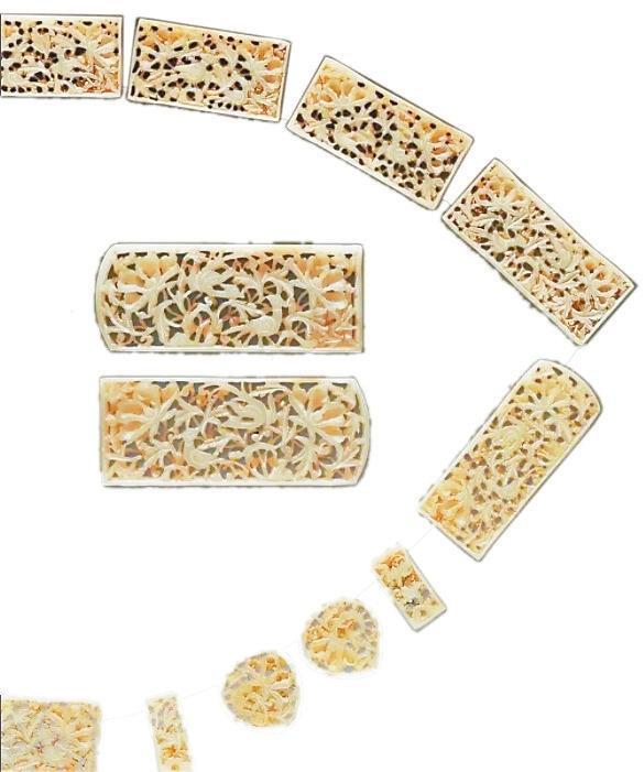 排方(fang)長5.1厘—7.6厘米、寬3.3厘米、厚0.7厘米,1955年蘭州(zhou)市上西(xi)園明墓出(chu)土。青灰色和田玉鏤雕而(er)成,包(bao)括三(san)臺1、弼輔(fu)4、圓(yuan)桃4、鉈尾2、排方(fang)7,均透雕牡丹花枝,邊緣(yuan)有(you)界欄。其中四塊較大的(de)長條排方(fang),雕飾最為精美(mei),于繁(fan)花密(mi)葉間配置一對雉雞,構圖繁(fan)縟,富于變(bian)化,顯示出(chu)工匠(jiang)高超的(de)技術(shu)造詣。