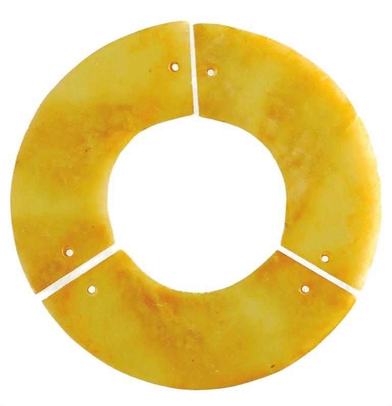 玉璜長11.5厘米(mi)(mi)、寬3.5厘米(mi)(mi)、厚0.3厘米(mi)(mi),征集所(suo)得。青玉料,色灰白,有黃褐或(huo)灰白沁斑(ban),質(zhi)地細(xi)潤(run)透亮。弧形片(pian)狀,共三塊。每塊兩端邊齊直,并各有一個(ge)單面鉆小孔,制作規整。