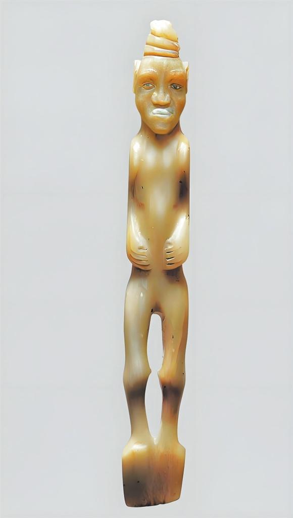 玉人形鏟高17.6厘米,1967年靈臺縣白草坡M1出土。圓雕工藝(yi),人物裸體站像。發辮虎首蛇身盤成堆髻。長臉,闊鼻(bi),深眼窩,大耳,厚(hou)唇前突,兩(liang)手捧腹,兩(liang)腿間呈(cheng)“8”形鏤空,雙足并攏作鏟形。
