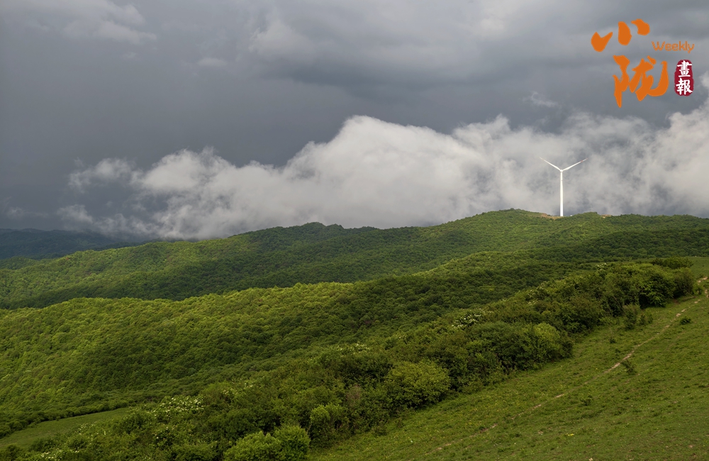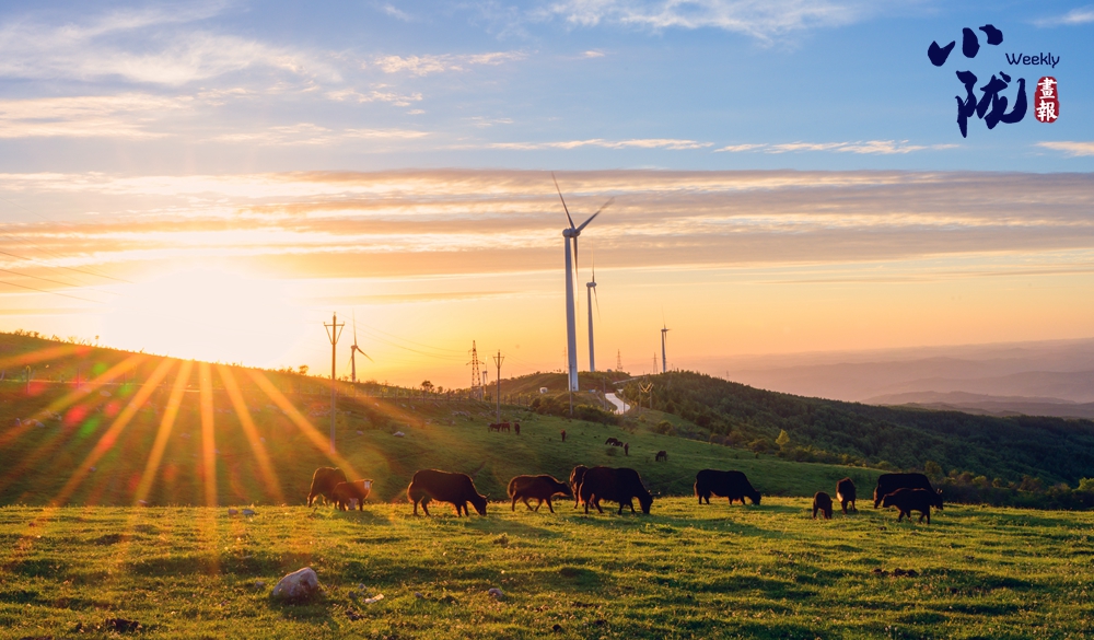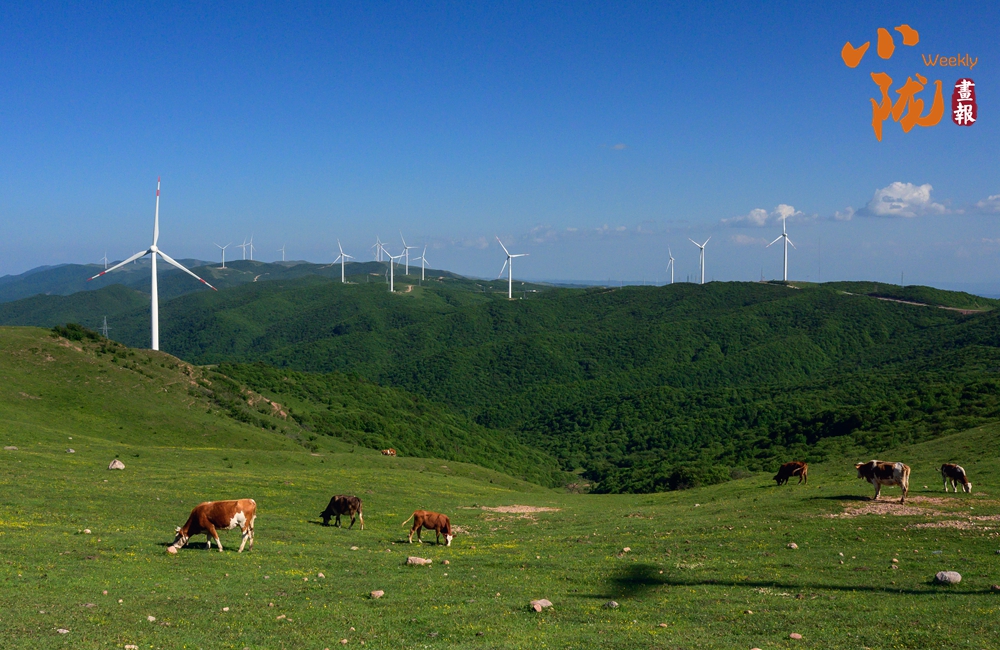 廣闊的牧場,一望無垠。綠油油的牧草覆蓋整片天地,宛如一片綠色的海洋。草原上游走的牛羊,與天空浮云、遠景的群山、矗立的風力發電機交相輝映,極目遠望、蔚為壯觀,構成關山古道一道靚麗風景線。
