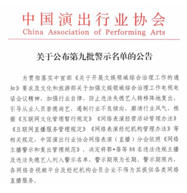 中(zhong)國演出行業協會網絡(luo)表演(直(zhi)播)分會近(jin)日發布了第九批(pi)網絡(luo)主(zhu)(zhu)播警示(shi)名(ming)(ming)單,包括“鐵(tie)山靠”“郭老師”兩(liang)名(ming)(ming)職業主(zhu)(zhu)播和“吳亦凡”“鄭爽(shuang)”“張哲瀚”三名(ming)(ming)演員在(zai)內的(de)88名(ming)(ming)主(zhu)(zhu)播將在(zai)行業內被實行聯合抵制(zhi)和懲(cheng)戒。這是違法失德藝人(ren)首(shou)次(ci)被納入網絡(luo)主(zhu)(zhu)播警示(shi)名(ming)(ming)單中(zhong),防止(zhi)劣跡藝人(ren)轉移陣地復出。