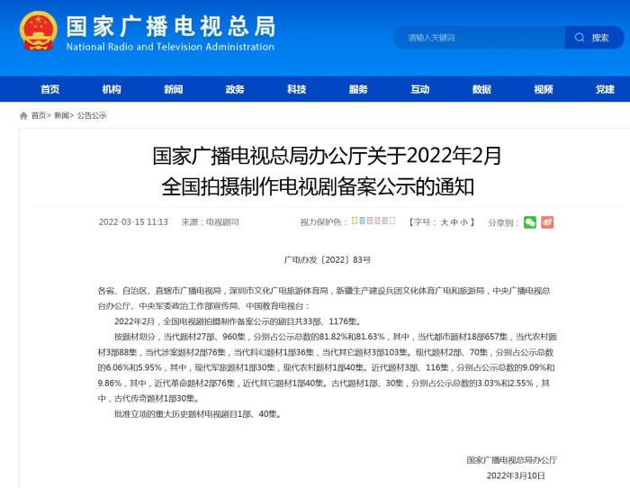 3月15日,國家廣播電視(shi)(shi)總局網站(zhan)刊發關于2022年2月全(quan)國拍攝(she)制(zhi)作(zuo)電視(shi)(shi)劇備(bei)案公示(shi)的通(tong)知(以(yi)下(xia)簡稱通(tong)知)。其中顯示(shi),2022年2月,全(quan)國電視(shi)(shi)劇拍攝(she)制(zhi)作(zuo)備(bei)案公示(shi)的劇目(mu)共33部、1176集。