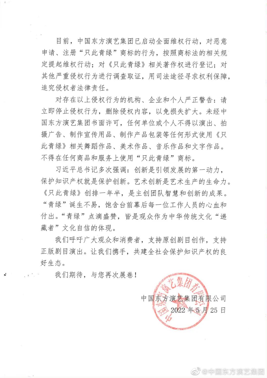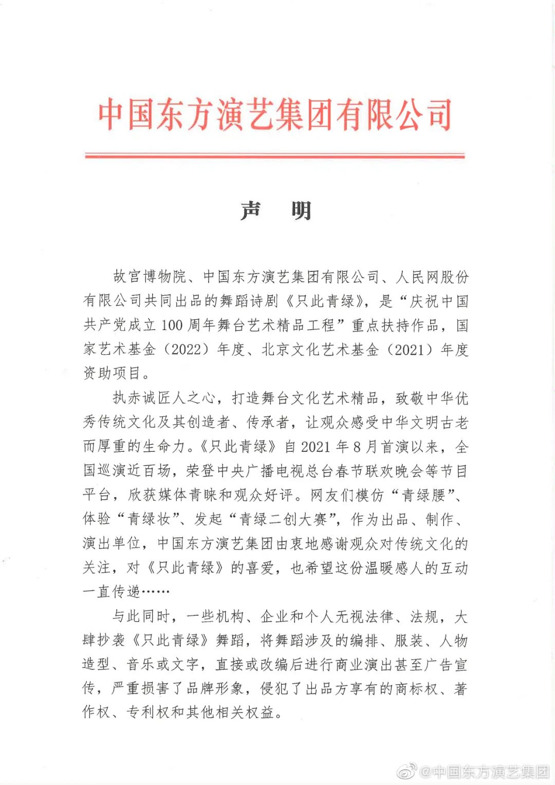 作為(wei)舞蹈詩劇《只此青綠》出(chu)品方(fang)之一,中國東(dong)方(fang)演藝集團25日發表聲(sheng)明,已啟(qi)動對(dui)《只此青綠》的全面維權行動。