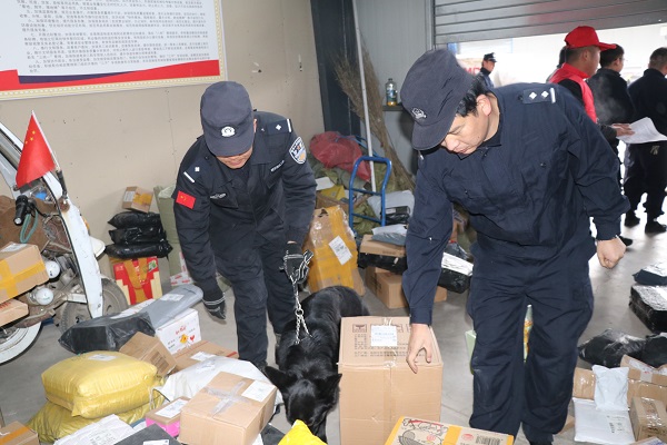 近日,臨洮縣公安局組織禁毒大隊、刑事偵查大隊警犬中隊聯合縣禁毒辦,對轄區物流園區各寄遞物流網點突擊檢查并宣傳毒品預防知識。圖為民警攜帶警犬對部分郵包進行查驗。 通訊員 李鴻昌 攝