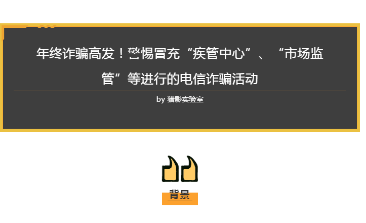 原(yuan)標題:年終詐(zha)騙高發!警惕冒充“疾管(guan)中(zhong)心”“市場(chang)監管(guan)”等(deng)進行(xing)的電信詐(zha)騙活動