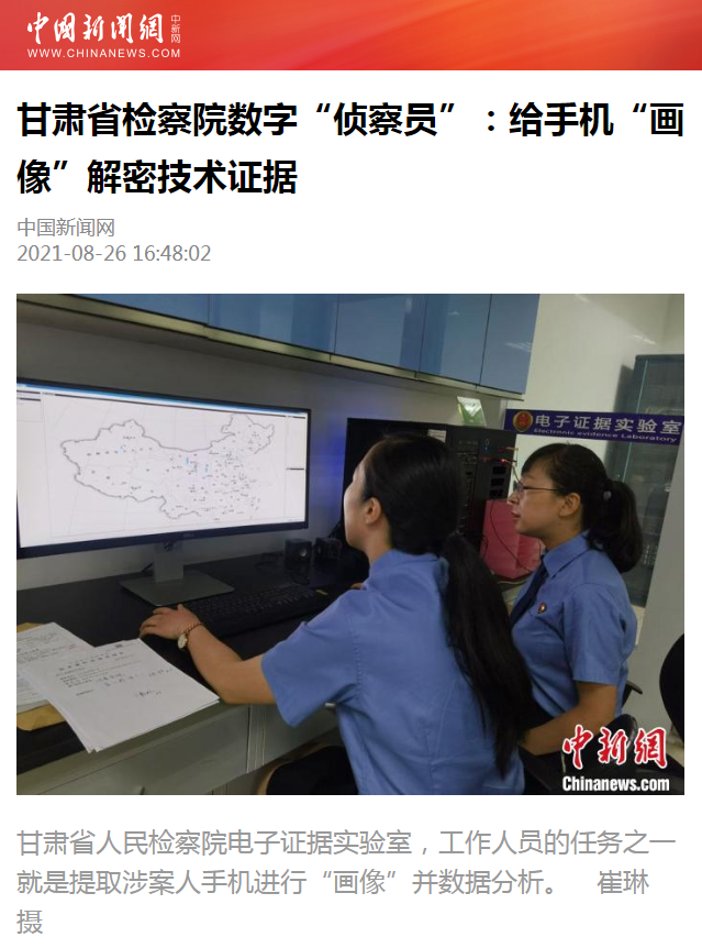 2021年8月26日,中(zhong)國新(xin)聞(wen)網(wang)發布新(xin)聞(wen)《甘肅省(sheng)檢察(cha)(cha)院數字“偵(zhen)察(cha)(cha)員”:給手(shou)機“畫(hua)像”解密技術證據》。