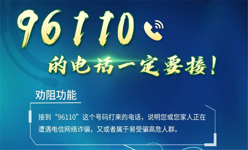 公安機關提醒:96110是官方預警(jing)勸阻(zu)專線,如接到“96110”號碼來電(dian),說明機主(zhu)本人(ren)(ren)或其(qi)家人(ren)(ren)正遭(zao)遇電(dian)信(xin)網絡詐騙,請一定(ding)及時接聽(ting)并耐(nai)心(xin)聽(ting)取民警(jing)的勸阻(zu)提示,避免上當受騙。