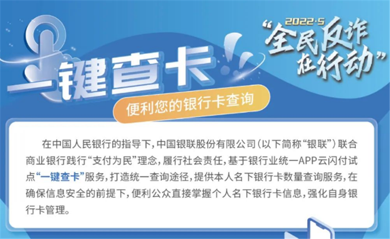 為(wei)解決群眾(zhong)對于(yu)跨行(xing)(xing)(xing)(xing)銀(yin)(yin)行(xing)(xing)(xing)(xing)卡(ka)賬戶(hu)查(cha)(cha)詢的(de)(de)訴(su)求(qiu),2021年12月,人民銀(yin)(yin)行(xing)(xing)(xing)(xing)指導中(zhong)國銀(yin)(yin)聯股份有限公司(si)聯合商業銀(yin)(yin)行(xing)(xing)(xing)(xing)基于(yu)銀(yin)(yin)行(xing)(xing)(xing)(xing)業統一APP云(yun)閃(shan)付試點“一鍵查(cha)(cha)卡(ka)”功能(neng),打(da)造統一查(cha)(cha)詢途徑,向(xiang)公眾(zhong)提(ti)(ti)供銀(yin)(yin)行(xing)(xing)(xing)(xing)卡(ka)數(shu)量、每張(zhang)卡(ka)的(de)(de)銀(yin)(yin)行(xing)(xing)(xing)(xing)名稱、借貸記屬(shu)性、脫敏卡(ka)號等信(xin)息的(de)(de)查(cha)(cha)詢,在確保信(xin)息安全的(de)(de)前提(ti)(ti)下,便利公眾(zhong)直(zhi)接掌握(wo)個人名下銀(yin)(yin)行(xing)(xing)(xing)(xing)卡(ka)信(xin)息,強化自身銀(yin)(yin)行(xing)(xing)(xing)(xing)卡(ka)管理。
