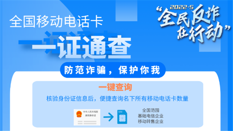 詐(zha)騙分子冒(mao)用(yong)他人身(shen)(shen)份開辦電話卡(ka)嚴重侵害用(yong)戶本人合法權益(yi),廣大群(qun)眾對此深惡痛絕。“一證(zheng)通查”服務打通了93家省級基礎電信(xin)(xin)企業(ye)和39家移(yi)動(dong)(dong)通信(xin)(xin)轉售(shou)企業(ye)相(xiang)關數(shu)據,群(qun)眾只(zhi)需要使用(yong)自己的(de)(de)居民身(shen)(shen)份證(zheng),即可(ke)通過線(xian)上線(xian)下多種渠(qu)道(dao)查詢(xun)本人名下持有的(de)(de)全(quan)國移(yi)動(dong)(dong)電話卡(ka)數(shu)量,專用(yong)短信(xin)(xin)端(duan)口10699000將(jiang)在48小時內向預留手機號反(fan)饋結果,真正實現了全(quan)國移(yi)動(dong)(dong)電話卡(ka)的(de)(de)統一便捷查詢(xun)。