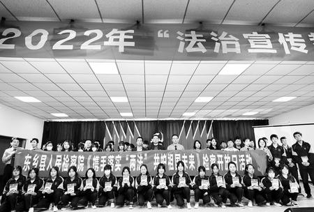 東鄉(xiang)縣檢察院(yuan)和(he)民族中學共同舉(ju)辦“攜手落(luo)實(shi)‘兩法’共護祖國未來”檢察開放日宣講(jiang)活動(2022年5月31日拍攝)。 東鄉(xiang)縣檢察院(yuan)供圖