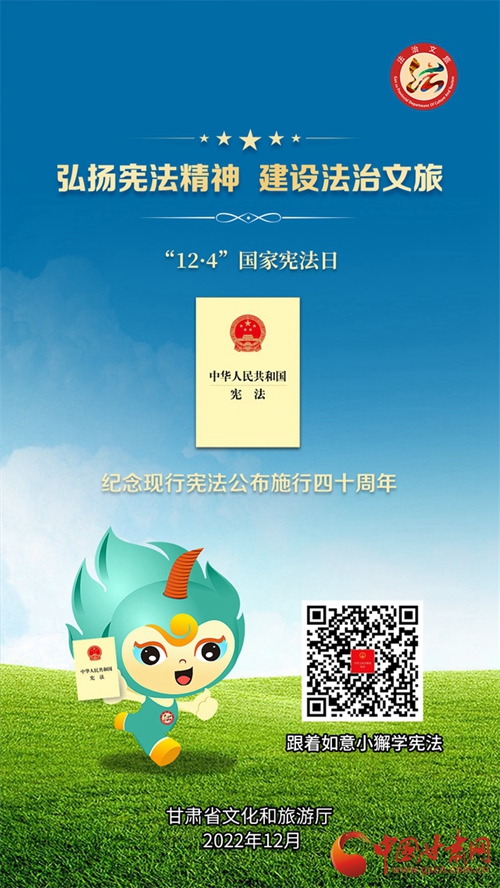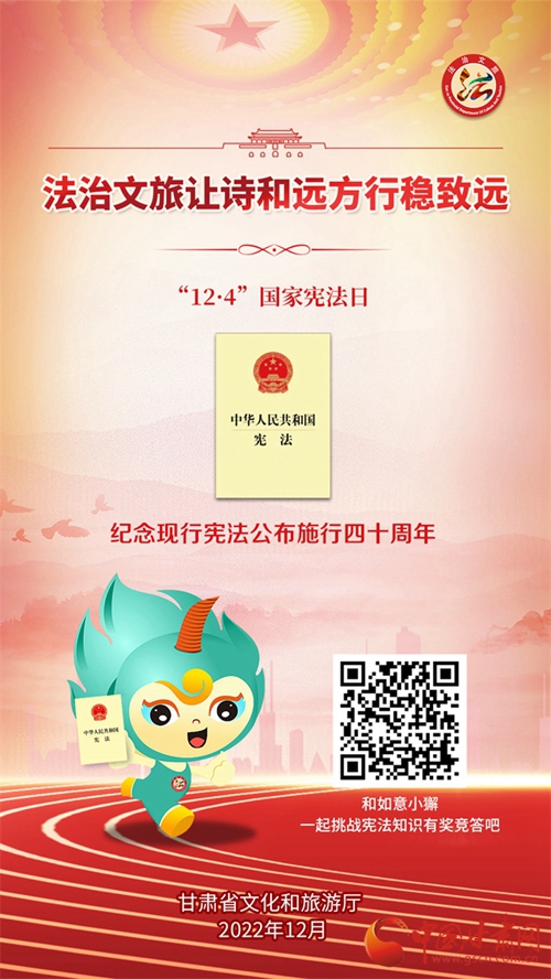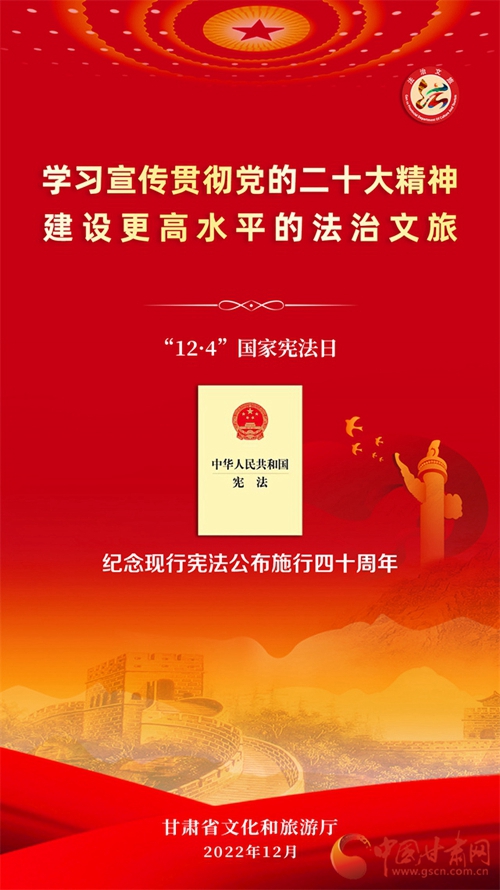 中國甘肅網12月(yue)7日訊 (本網記(ji)者 張(zhang)蘭琴)自(zi)12月4日國家憲法(fa)(fa)(fa)日暨(ji)憲法(fa)(fa)(fa)宣(xuan)(xuan)傳(chuan)周(zhou)啟動以來,我省各(ge)地開(kai)(kai)展了(le)形式多(duo)樣的宣(xuan)(xuan)傳(chuan)活動,為深入學習宣(xuan)(xuan)傳(chuan)貫徹黨的二十大(da)精神(shen),不斷增強人民群眾法(fa)(fa)(fa)治(zhi)意識,形成全民維護憲法(fa)(fa)(fa)的濃厚氛圍,同(tong)時加強文化和旅(lv)游(you)的法(fa)(fa)(fa)治(zhi)宣(xuan)(xuan)傳(chuan)教(jiao)育,省文旅(lv)廳近日開(kai)(kai)展了(le)國家憲法(fa)(fa)(fa)日暨(ji)憲法(fa)(fa)(fa)宣(xuan)(xuan)傳(chuan)周(zhou)系列活動。